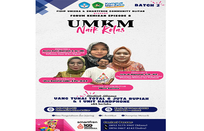 Fakultas Ilmu Sosial dan Politik UNISBA Blitar kembali berkolaborasi dengan Smartfren Community Blitar gelar Forum Kemisan dalam tema UMKM Naik Kelas Batch 2 pada Kamis, 27 Februari 2025 di Aula Majapahit Universitas Islam Balitar Blitar. Kegiatan ini mendorong pengembangan dan strategi pemasaran digital UMKM di wilayah Blitar Raya dalam enghadapi tantangan dan peluang bisnis si era digital.